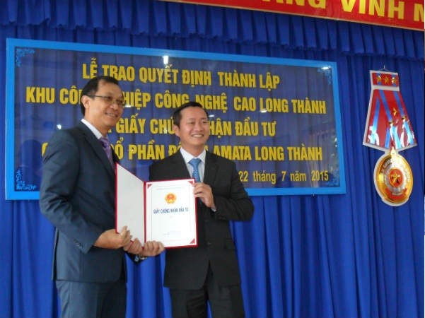 Ông Cao Tiến Sỹ, Trưởng ban quản lý các khu công nghiệp Đồng Nai trao Giấy chứng nhận đầu tư cho ông Kiatthanakorn Surakij, Tổng giám đốc Công ty cổ phần đô thị Amata Long Thành