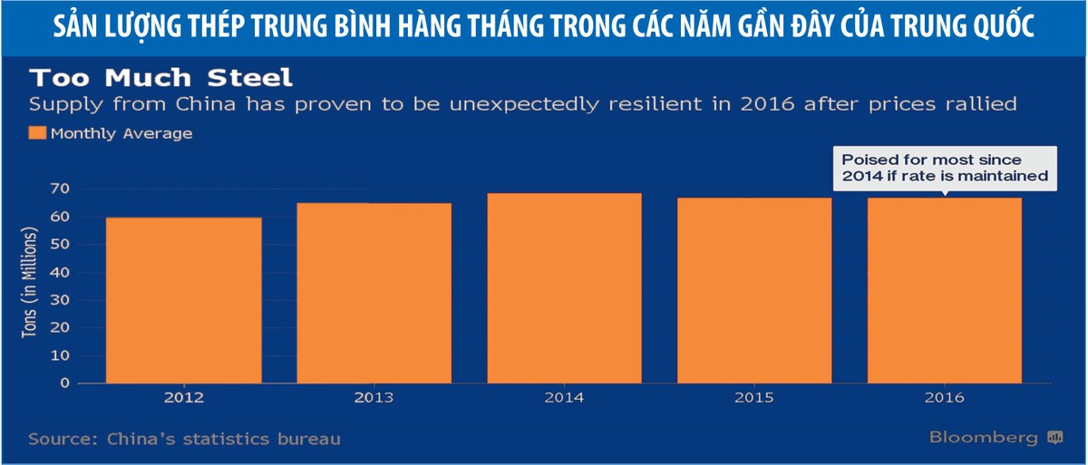 Trung Quốc sản xuất một nửa sản lượng thép trên toàn cầu và chủ yếu dành cho hoạt động xuất khẩu khi năng lực sản xuất tăng trưởng quá nhanh so với nhu cầu nội địa. Lượng thép xuất khẩu từ Đại lục ra nước ngoài tăng gấp 4 lần kể từ khi khủng hoảng kinh tế năm 2008 diễn ra, đạt mức kỷ lục trong năm ngoái, trong khi giá của loại vật liệu này giảm tới 64% so với mức đỉnh vào năm 2011. Mặc dù thị trường thép đã có sự phục hồi nhẹ trở lại sau cú sốc giảm giá năm ngoái nhờ nhu cầu từ Trung Quốc hồi phục, tình trạng dư cung trên thị trường vẫn khiến hàng loạt nhà sản xuất thép phải đóng cửa ở cả 5 lục địa.