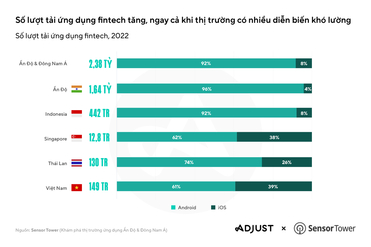 Mặc dù nền kinh tế toàn cầu bất ổn trong năm qua, cùng với thị trường chứng khoán sụt giảm, nhưng số lượt tải ứng dụng Fintech tại khu vực Ấn Độ và Đông Nam Á tăng trong giai đoạn 2021 - 2022. Số lượt tải ứng dụng Fintech tại Ấn Độ tăng 32% vào năm 2022, tiếp là Việt Nam 15% và Indonesia 10%. Thái Lan và Singapore là hai trường hợp ngoại lệ, số lượt tải tại hai quốc gia này lần lượt giảm 11% và 2%.