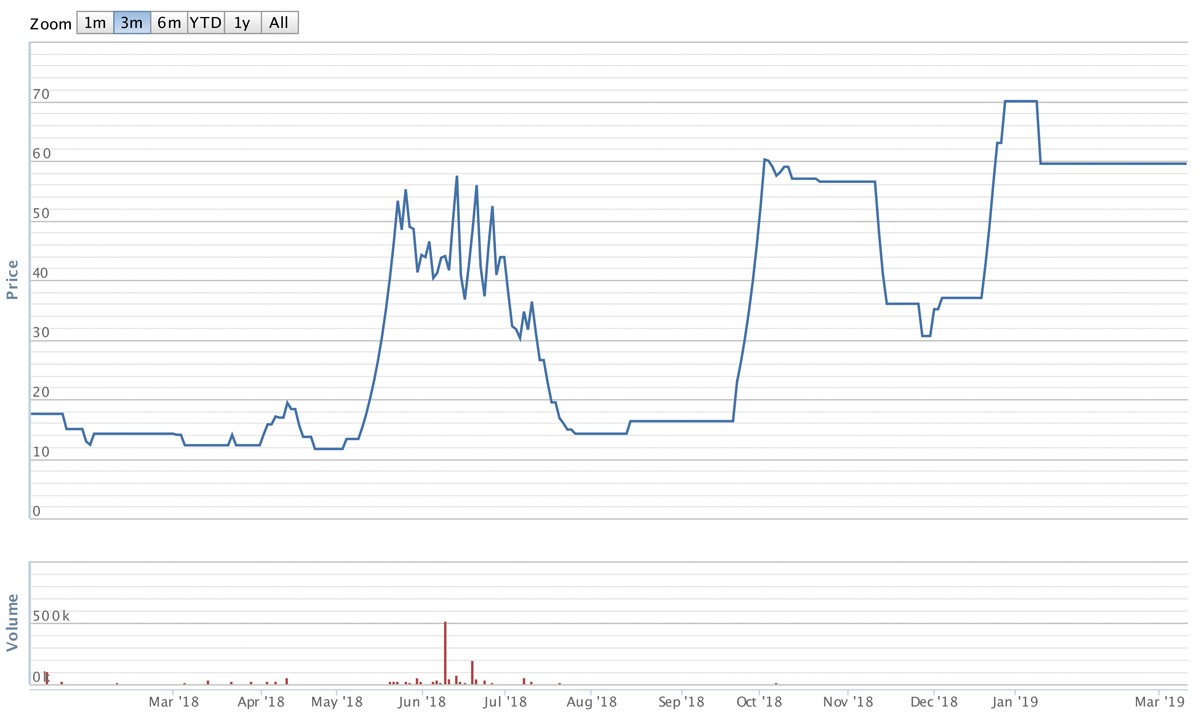 Trong một số phiên giao dịch đầu năm 2019, giá cổ phiếu EME rơi từ mức 70.000 đồng/cổ phiếu xuống 59.500 đồng/cổ phiếu và duy trì từ đó đến nay vì giá mua - bán không gặp nhau.