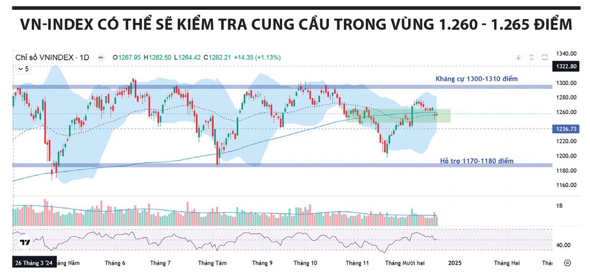VN-Index đã đánh mất trạng thái cân bằng trên 1.260 điểm, nhưng điểm tích cực là dòng tiền tại một số nhóm dẫn dắt như chứng khoán được duy trì và giữ vai trò là mỏ neo khá vững chắc cho thị trường. Do đó, VN-Index nhiều khả năng sẽ tiếp tục được hỗ trợ và hồi phục để kiểm tra cung cầu trong vùng 1.260 - 1.265 điểm trong tuần này.
