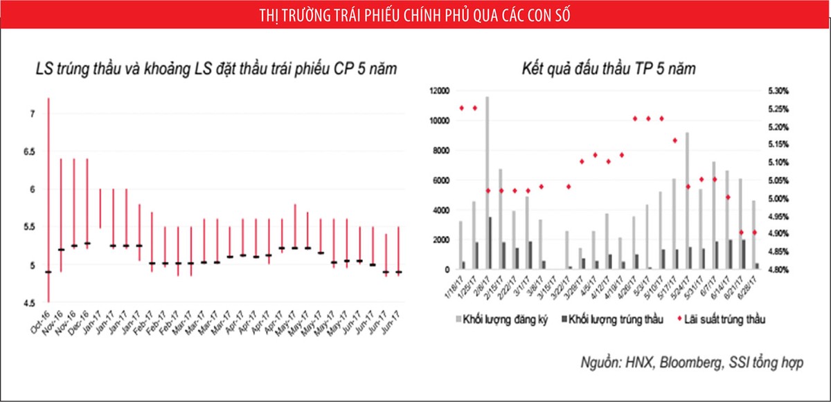 Với sự tham gia sôi động của các nhà đầu tư, lãi suất trúng thầu trái phiếu chỉnh phủ 6 tháng đầu năm 2017 đã giảm trên tất cả các kỳ hạn. Chẳng hạn, lãi suất trúng thầu trái phiếu Kho bạc Nhà nước giảm từ 0,11 - 0,71%/năm so với cuối năm 2016. Trong đó, kỳ hạn 20 năm có lãi suất giảm mạnh nhất là 0,71%/năm, tiếp đến là kỳ hạn 15 năm giảm 0,56%/năm, kỳ hạn 30 năm giảm 0,43%/năm so với cuối năm 2016.