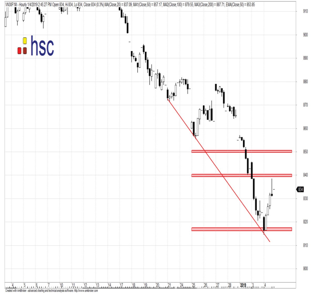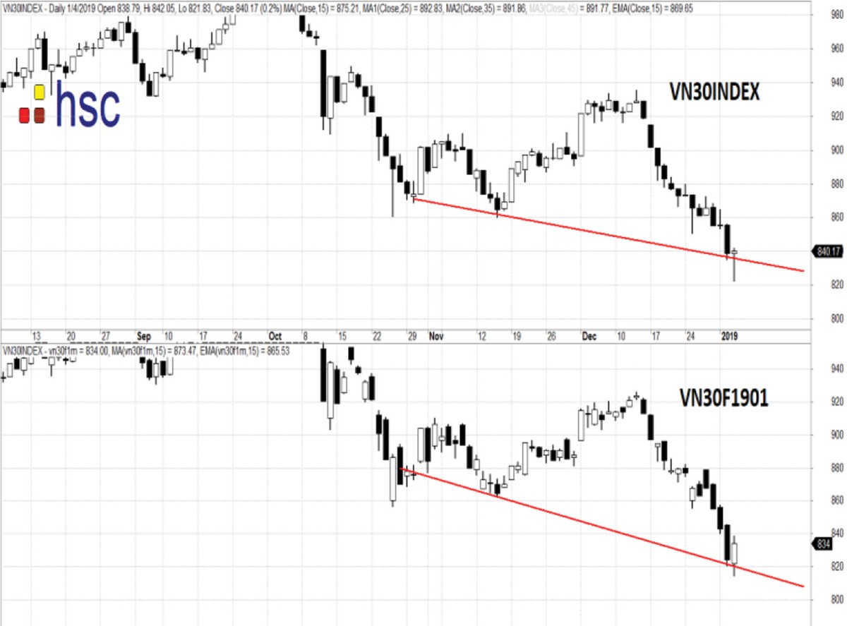 Tâm lý nhà đầu tư vẫn kém, nên khả năng bứt phá của thị trường trong những phiên đầu tuần có xác suất không cao. Kịch bản khả dĩ là thị trường còn giằng co, rung lắc quanh vùng đáy cũ 815 - 820 trên VN30F1901.