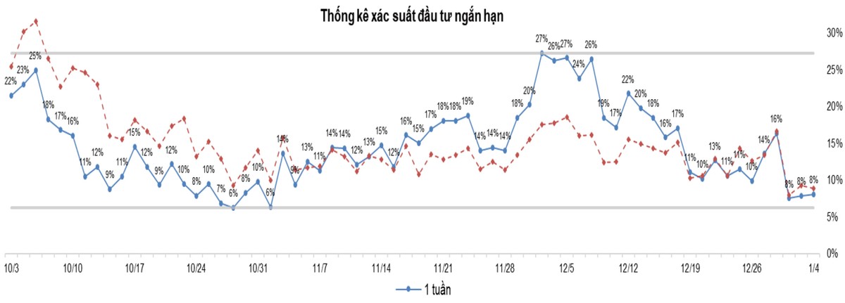 Trong khi đó, đà lan tỏa trung bình 10 phiên (màu đỏ) mặc dù đang xuống vùng quá bán (< 30%) nhưng chưa phải là mức thấp nhất từng ghi nhận, điều này cũng trùng khớp với cách nhìn trong 1 - 2 phiên.