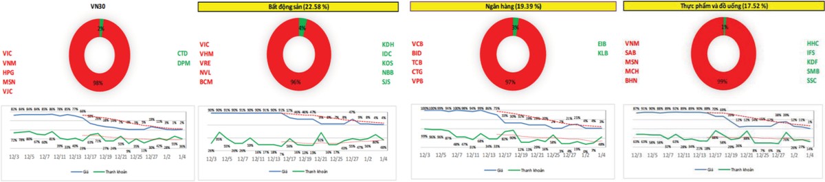 Xét theo mức độ đóng góp về vốn hóa, các cổ phiếu trong nhóm dẫn dắt như bất động sản, ngân hàng, thực phẩm và đồ uống gần như đều tiêu cực.