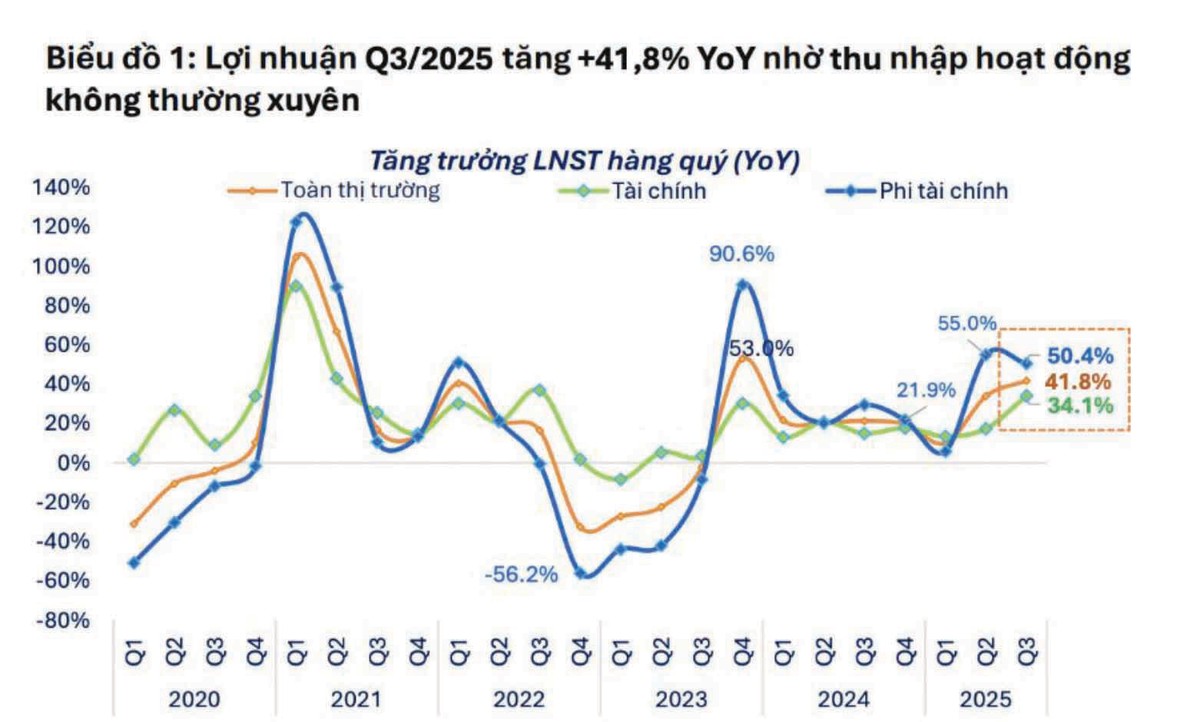 Thị trường đã ghi nhận bức tranh lợi nhuận quý III/2025 rất tích cực, khi lợi nhuận sau thuế toàn thị trường tăng 41,8% so với cùng kỳ. Nhóm phi tài chính tiếp tục dẫn dắt với mức tăng 50,4%, trong khi nhóm tài chính tăng 34,1%.