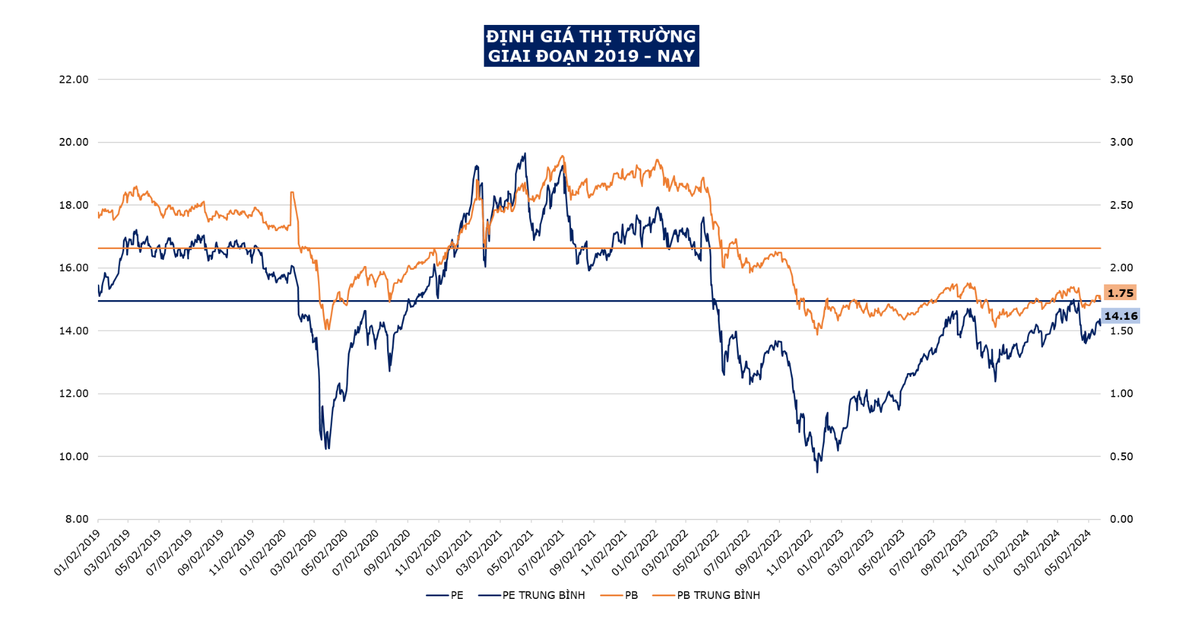 Định giá của thị trường hiện tại cũng đang ở vùng hấp dẫn, với mức PE đạt khoảng 14 lần, thấp hơn mức trung bình là 15 lần hay PB đạt 1,75 lần, thấp hơn mức trung bình khoảng 2,2 lần trong 5 năm qua. Với kỳ vọng năm nay EPS thị trường tăng khoảng 17 - 20%, có thể thấy đây là mức định giá hấp dẫn cho vị thế 6 - 12 tháng tới.