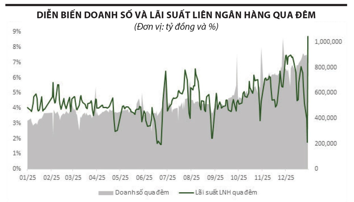Đáng chú ý, ngay sau giai đoạn hạ nhiệt, lãi suất liên ngân hàng qua đêm đã bật tăng trở lại lên mức 8-9%/năm vào ngày cuối cùng của tháng 12 trên hầu hết các kỳ hạn, buộc Ngân hàng Nhà nước phải tiếp tục bơm ròng, đưa tổng khối lượng lưu hành trên thị trường mở lên mức kỷ lục 409.000 tỷ đồng trong năm 2025. Dù các biện pháp hỗ trợ thanh khoản vẫn đang được cơ quan này luân phiên triển khai, song chủ yếu mang tính ngắn hạn.