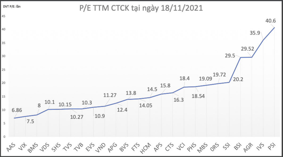 Theo số liệu của Fiintrade, chỉ số P/E TTM của các cổ phiếu chứng khoán niêm yết (xác định theo giá đóng cửa ngày 18/11 và EPS trong 4 quý gần nhất) phổ biến nằm trong khoảng 10 - 20 lần.