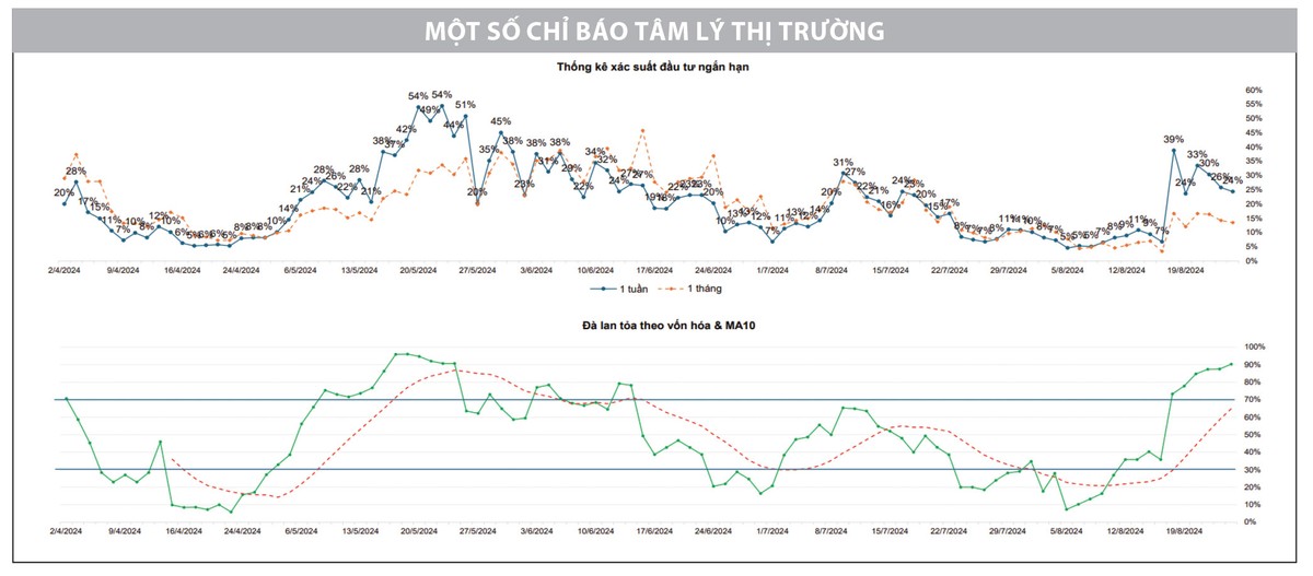 Các chỉ báo tâm lý thị trường cho thấy, dòng tiền vào thị trường mở rộng hơn, thanh khoản tăng lên mạnh mẽ khiến xác suất đầu tư thành công đang trong xu thế tăng lên. Đà lan tỏa thị trường cũng gia tăng, với những dấu hiệu dòng tiền quay trở lại trước sự dẫn dắt của nhóm cổ phiếu vốn hóa lớn, nhất là ngân hàng. Bên cạnh đó, diễn biến lan tỏa được ghi nhận ở nhiều nhóm cổ phiếu khác. Đường đà lan tỏa sau khi cắt lên đường MA10 đã hình thành xu hướng tăng.