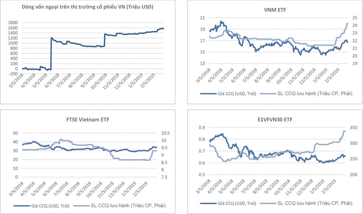 Thống kê trong vòng 1 tháng, kể từ ngày 4/2 - 3/3/2019 của Công ty Chứng khoán VietinBank cho thấy, dòng vốn ngoại đổ vào thị trường cổ phiếu Việt Nam đạt 111,6 triệu USD. Lượng vốn chảy vào thị trường thông qua các quỹ ETF khá lớn, có thể kết đến Quỹ V.N.M ETF với lượng phát hành chứng chỉ quỹ mới có giá trị hơn 66 triệu USD.
