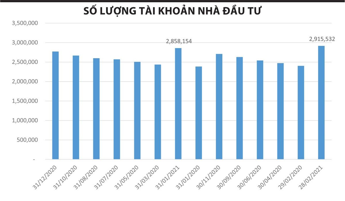 Theo công bố của Trung tâm Lưu ký chứng khoán (VSD), tới cuối tháng 2/2021, số tài khoản chứng khoán tại thị trường Việt Nam đạt hơn 2,91 triệu tài khoản. Hai tháng đầu năm, thị trường ghi nhận số tài khoản mở mới lên tới hơn 144.000, bằng 36% lượng mở mới của năm 2020.