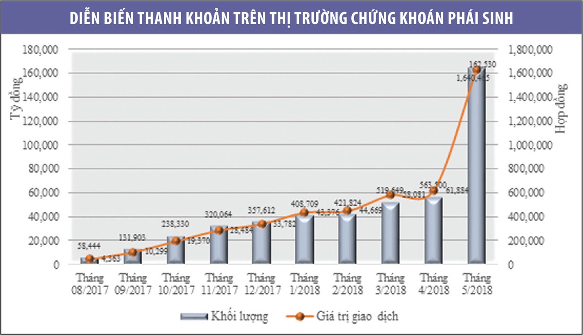 Tuy nhiên, bức tranh thanh khoản tại thị trường phái sinh tương phản rõ nét với thị trường cổ phiếu. Cụ thể, trong tháng 5/2018, thanh khoản bình quân của VN-Index (không tính thỏa thuận đột biến 267,8 triệu cổ phiếu VHM trị giá 30.700 tỷ đồng trong phiên 18/5) đạt 159,7 triệu đơn vị/phiên, giá trị bình quân 4.884 tỷ đồng/phiên, giảm 26,7% về khối lượng và 33% về giá trị so với tháng 4/2018. So với bình quân quý I/2018, khối lượng và giá trị giao dịch bình quân trong tháng 5 giảm lần lượt 37% và 34%.