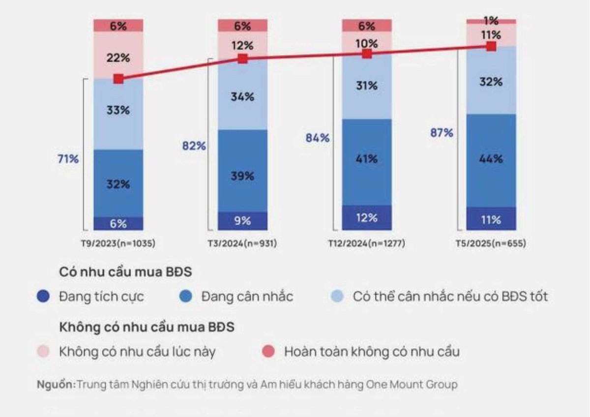Theo số liệu khảo sát của One Housing, từ mức 71% số người trả lời có thể cân nhắc chuyện mua nhà vào tháng 9/2023, tới nay đã tăng lên gần 90%. Đáng chú ý, tỷ lệ người ở mức độ sẵn sàng cao cũng tăng từ 38% lên hơn 55% sau gần 2 năm.