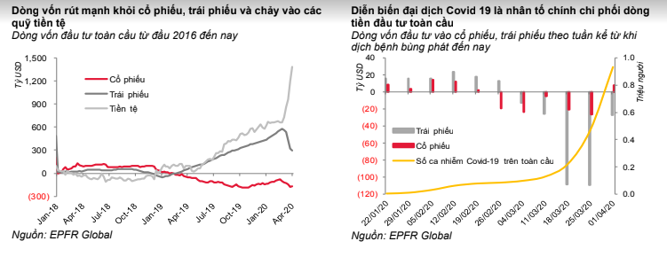 Phải mất 4 tháng từ tháng 11/2019 đến tháng 2/2020, các quỹ đầu tư cổ phiếu trên toàn cầu mới có dòng tiền vào 107 tỷ USD, nhưng chỉ trong tháng 3, các quỹ đã bị rút ra 75 tỷ USD. Các quỹ trái phiếu cũng bị rút mạnh, kể từ đầu tháng 3 tới nay, đã có 284 tỷ USD rút khỏi thị trường trái phiếu ở khắp các thị trường.