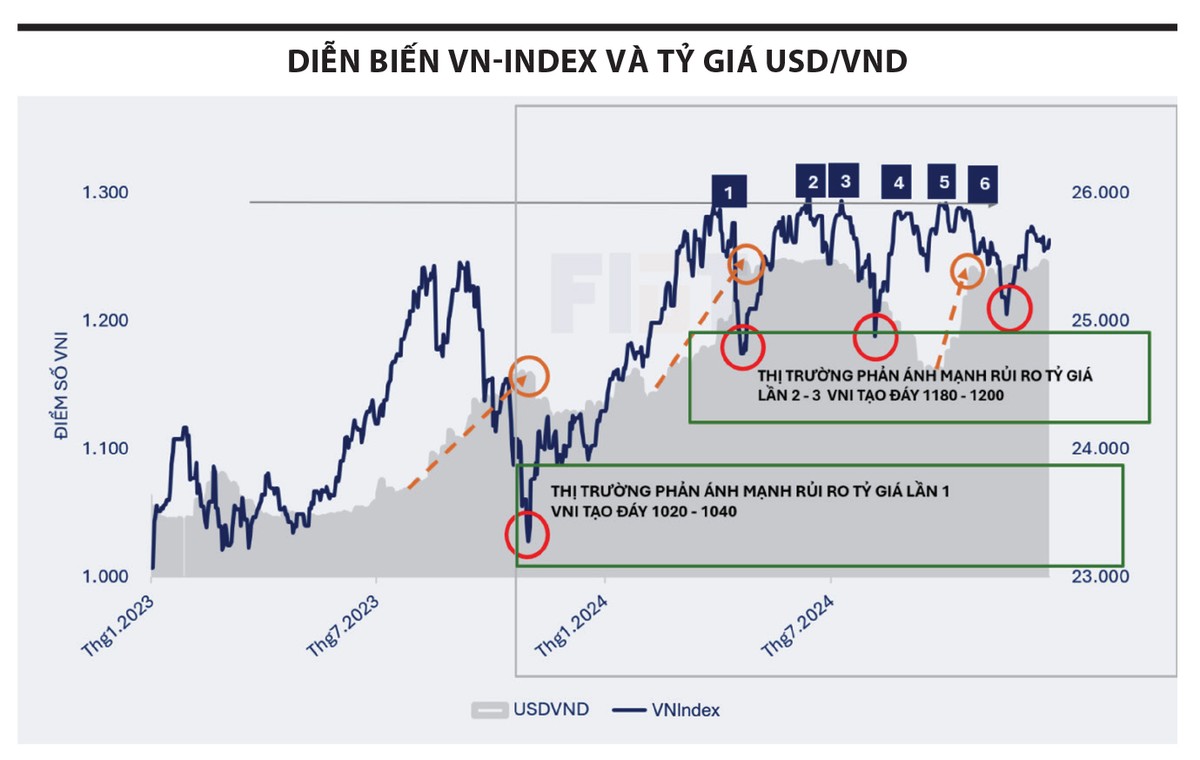 Một trong những thách thức lớn nhất đến từ áp lực tỷ giá, ảnh hưởng đến thị trường chứng khoán trong các giai đoạn quan trọng. Tỷ giá tăng cao buộc Ngân hàng Nhà nước phải thực hiện các biện pháp phòng ngừa như hút ròng thanh khoản qua kênh thị trường mở (OMO) và bán USD, gây sức ép đến dòng tiền thị trường. Đồng thời, khối ngoại bán ròng mạnh tay, kết hợp với rủi ro toàn cầu gia tăng trong các tháng 3, 6 và 10, làm suy yếu tâm lý nhà đầu tư, dẫn đến những đợt điều chỉnh sâu từ vùng 1.300 điểm, với mức giảm 8 - 10%.