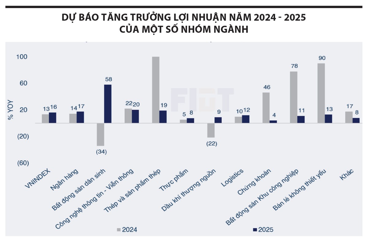 Tương tự, trong ngành bất động sản, các cổ phiếu lớn như VHM và NVL có lợi thế lớn nhờ doanh thu bán trước tăng mạnh, dự kiến lên tới 40% trong năm 2024, hỗ trợ lợi nhuận toàn ngành năm 2025 tăng trưởng. Đồng thời, các cải cách pháp lý và nhu cầu nhà ở cao (gấp đôi nguồn cung) sẽ là động lực chính giúp các doanh nghiệp lớn bứt phá.