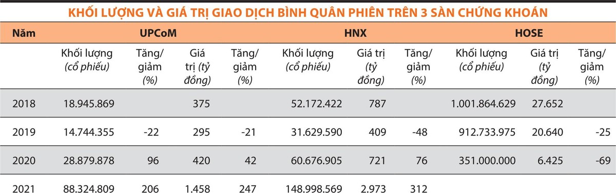Giá trị giao dịch quân mỗi phiên đạt gần 1.500 tỷ đồng, gấp 2,5 lần so với con số 420 tỷ đồng/phiên của năm 2020 và gấp 3 lần con số gần 300 tỷ đồng/phiên năm 2019. Giao dịch trên UPCoM thực sự bùng nổ từ năm 2021, tiếp nối sự bùng nổ của sàn HOSE và HNX từ nửa cuối năm 2020.