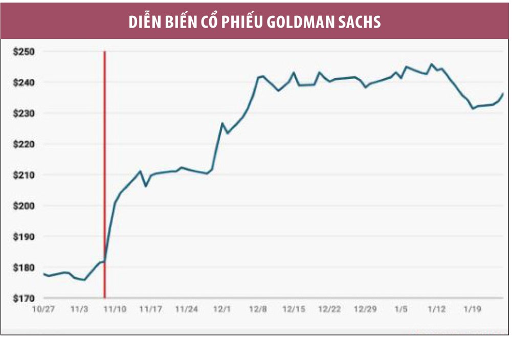 Theo sau cổ phiếu Goldman là JPMorgan với mức tăng 23%, chưa kể UnitedHealth và Travelers tăng lần lượt 13% và 8,5%.