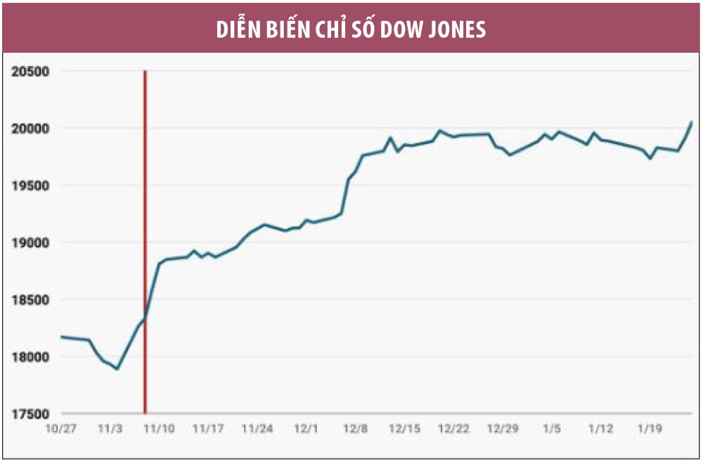 Tuy nhiên, điều này chỉ phản ánh một phần nhỏ của câu chuyện. Tổng thống Mỹ Donald Trump được coi là là yếu tố cốt lõi dẫn tới đà tăng của chỉ số Dow, cũng như nhiều chỉ số chứng khoán khác của Mỹ.