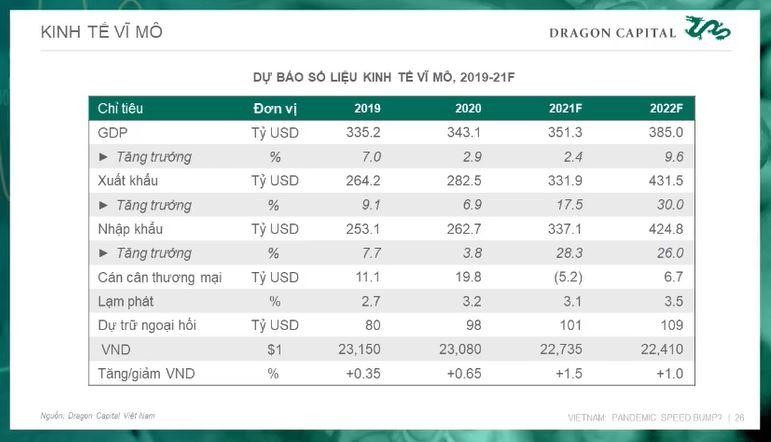 Dragon Capital dự báo, tăng trưởng GDP năm nay ước 2,4%, quý III tăng trưởng âm, nhưng năm 2022 có thể đạt mức tăng trưởng 8,5 - 9,6%. Nhập khẩu tăng cao năm nay nhưng năm sau sẽ ổn định, lạm phát cũng vậy, dự trữ ngoại hối tốt, tiền đồng khả năng tiếp tục tăng giá với USD năm sau.