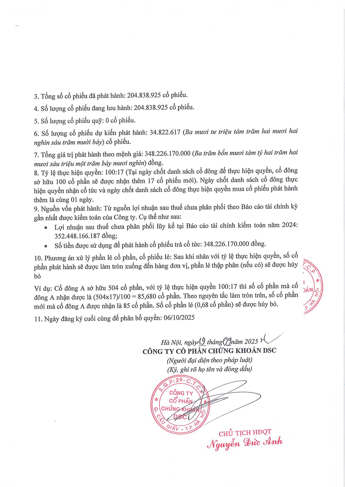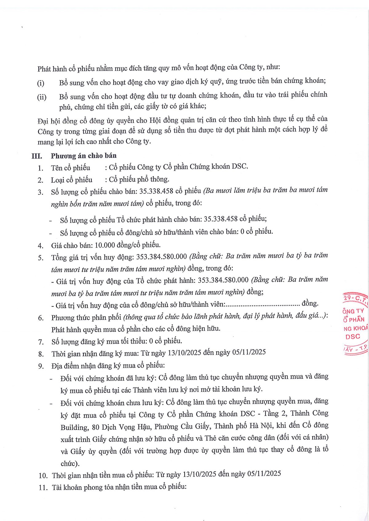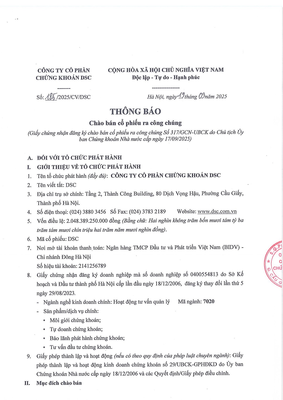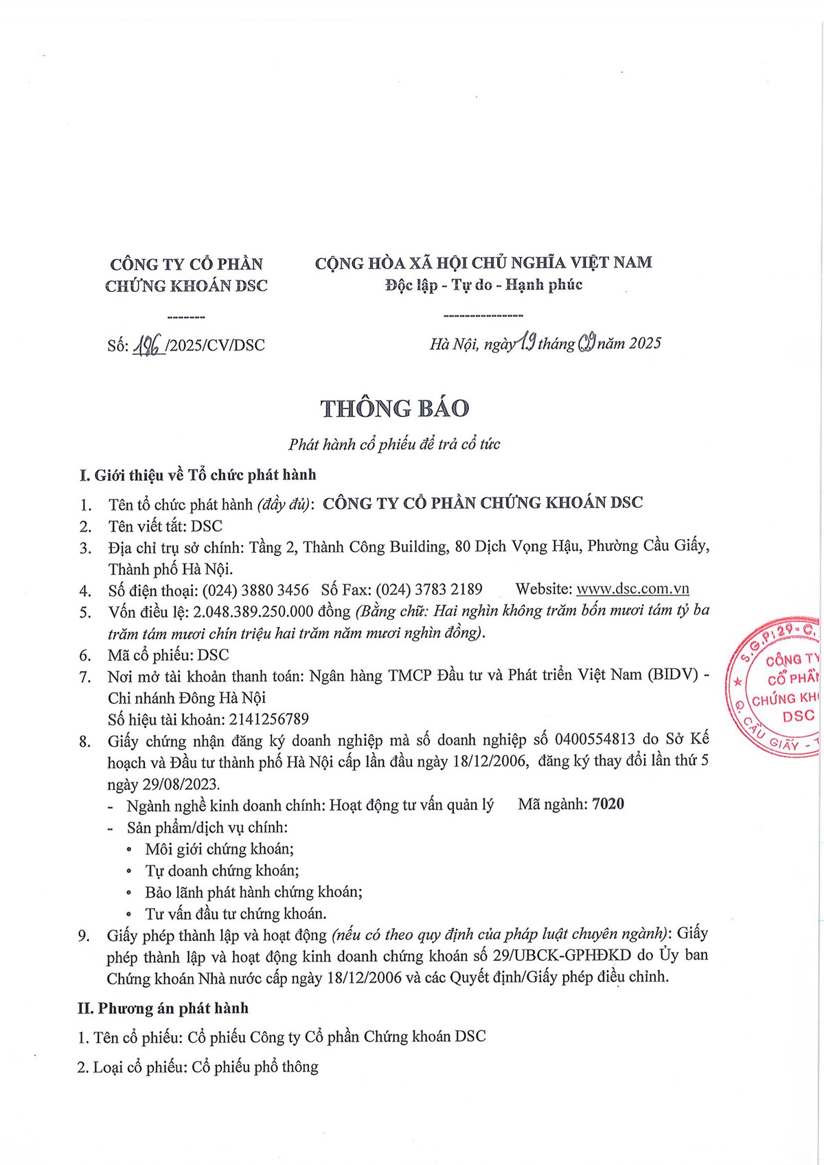 >> Chi tiết công bố thông tin Tin liên quan DSC thông báo phát hành ra công chúng và trả cổ tức (Kỳ 1) 21/09/2025 11:08 Tự doanh DSC hoàn thành 303% kế hoạch bán niên, lợi nhuận trước thuế đạt 123 tỷ đồng 10/07/2025 15:31 Chứng khoán DSC (DSC) lãi 67 tỷ đồng trong quý I/2025 10/04/2025 10:18 Từ khóa DSC