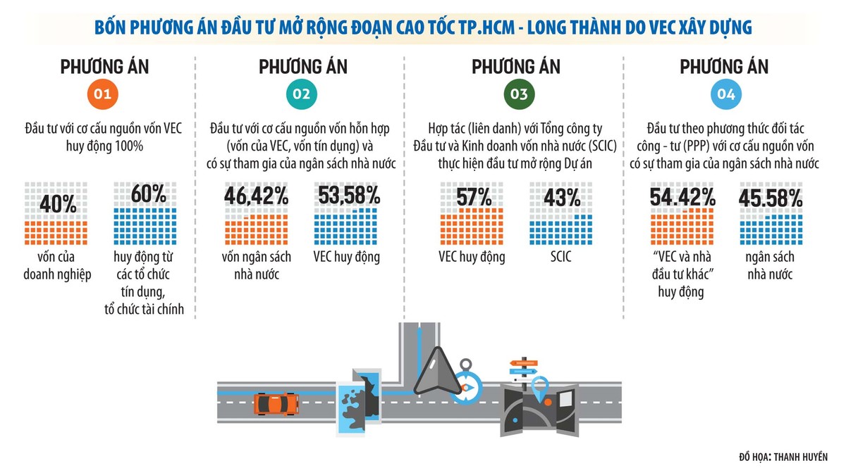 Trên cơ sở phân tích ưu, nhược điểm của 4 phương án đầu tư đầu tư mở rộng đoạn cao tốc TP.HCM - Long Thành do VEC đề xuất, Bộ GTVT ủng hộ phương án 2. Để có cơ sở đề xuất phương án này, Bộ GTVT đề nghị VEC phân tích bổ sung, làm rõ hình thức đầu tư theo phương án 2 là hình thức đầu tư gì theo quy định của pháp luật hiện hành; thẩm quyền thẩm định, phê duyệt chủ trương đầu tư, dự án đầu tư và ngân sách nhà nước tham gia Dự án sẽ được thực hiện như thế nào.