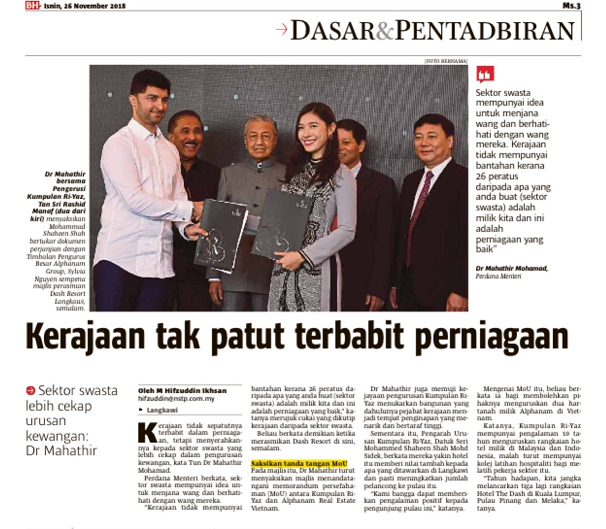 Lễ ký kết hợp tác chiến lược giữa Alphanam và Ri-Yaz Hotels & Resorts trước sự chứng kiến của Thủ tướng Malaysia - Mahathir Mohamad nhận được sự quan tâm lớn của truyền thông ASEAN