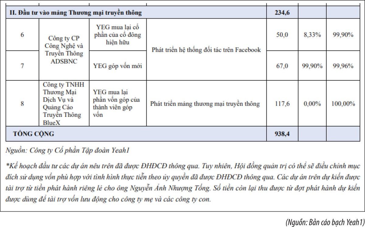 Đáng chú ý, Yeah1 sẽ chi 117,6 tỷ đồng để mua lại vốn góp của các thành viên góp vốn Công ty TNHH Thương mại dịch vụ và quảng cáo truyền thông BlueX; chi 50 tỷ đồng để nâng sở hữu Công ty cổ phần Công nghệ và truyền thông AdsBNS từ mức 8,33% lên 99,9% vốn điều lệ, đồng thời góp thêm 67 tỷ đồng vào công ty này. Phần còn lại của đợt huy động vốn sẽ bổ sung vốn lưu động cho Công ty mẹ và các công ty con.