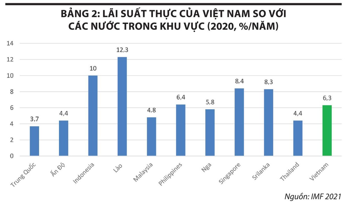 Lãi suất hiện đã ở mức thấp trong 20 năm qua (lãi suất cho vay 5 lĩnh vực ưu tiên hiện là 4,5%/năm), lãi suất cho vay khoảng 6-7%/năm đối với kỳ hạn ngắn và từ 9-11%/năm đối với kỳ hạn trung và dài năm 2021. Lãi suất thực (sau khi cấn trừ lạm phát) của Việt Nam hiện ở mức trung bình khu vực (Xem bảng 2).