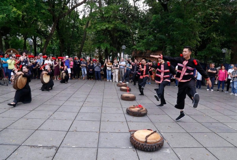 Những lời ca tiếng hát và vũ điệu mang đậm dấu ấn của văn hóa Tây Bắc qua các tiết mục nghệ thuật như: “Múa Trống hội bản Dao”, “Vũ điệu dưới trăng”, “Mùa vàng trên nương”, Múa chuông Dao”… khiến du khách trên phố đi bộ Hồ Gươm mê say.