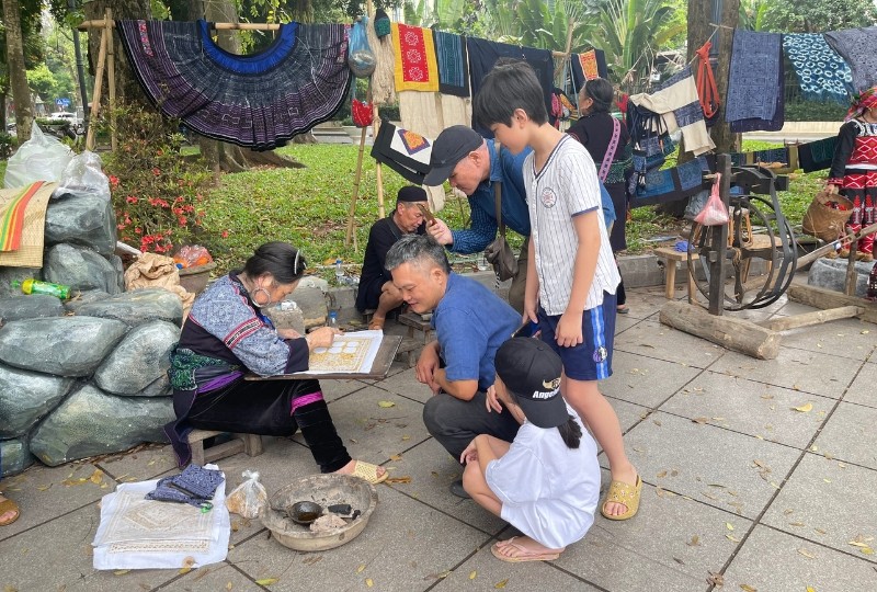 Khu vực các nghệ nhân Sa Pa tái hiện làm nghề thủ công truyền thống như:mây tre đan, dệt dây hoa, vẽ sáp ong, thêu hoa văn trang phục Mông đen, nghề làm trống… cũng thu hút đông đảo sự quan tâm của du khách thủ đô và quốc tế…