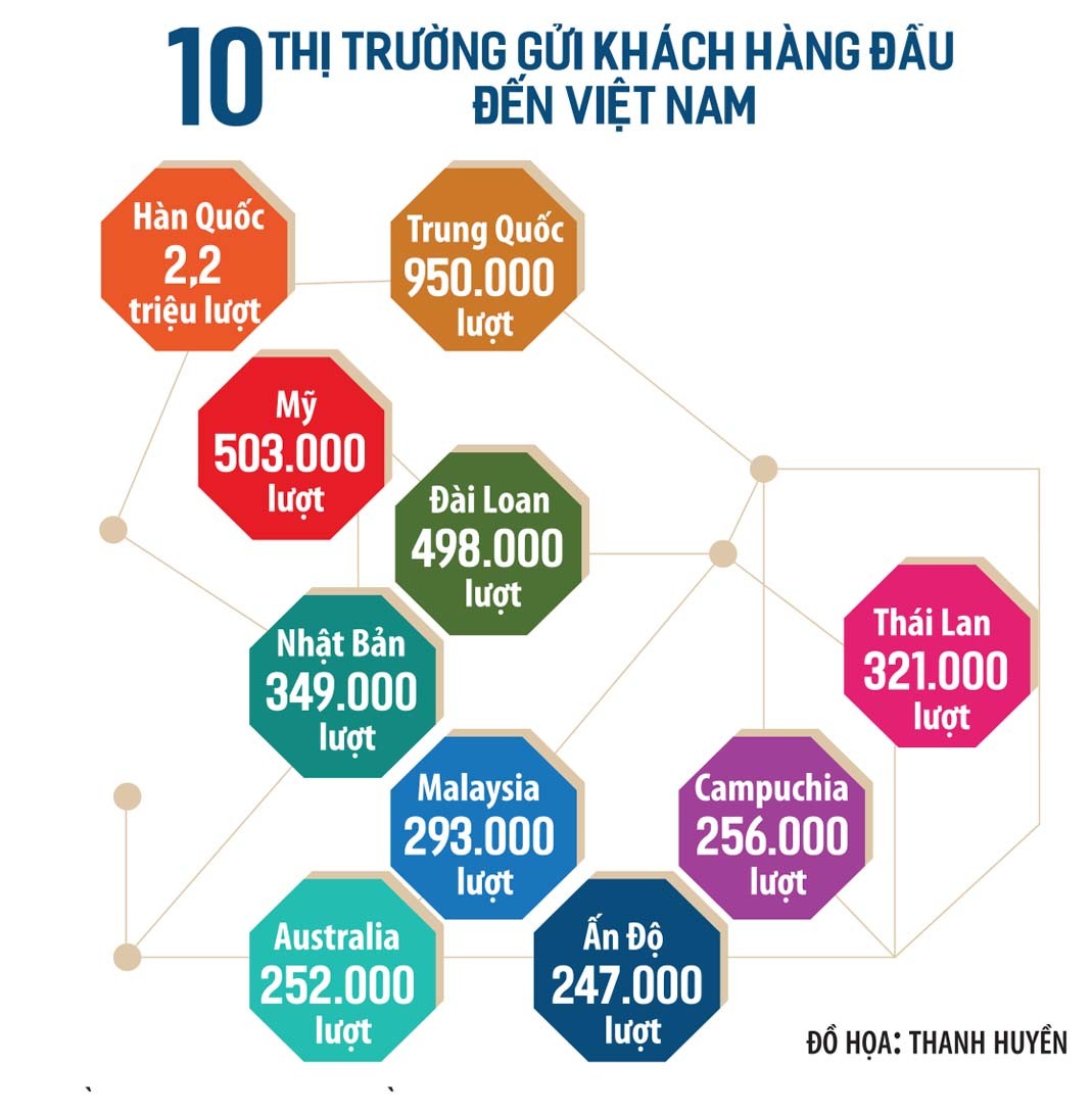 Hàn Quốc vẫn là thị trường gửi khách lớn nhất trong 8 tháng đầu năm với 2,2 triệu lượt, chiếm gần 30% tổng lượng khách. Trung Quốc xếp thứ hai với 950.000 lượt và Mỹ xếp thứ ba với 503.000 lượt.