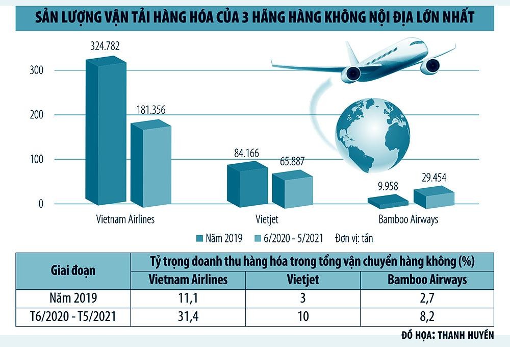 Cục Hàng không Việt Nam cho biết, đến cuối tháng 6/2021, các hãng hàng không đã hoán đổi 9 tàu bay sang chở hàng theo hình thức tháo ghế hành khách để chở hàng trên khoang. Một số tàu bay (chưa tháo ghế) cũng chở hàng trên khoang hành khách với điều kiện không chở khách trên cùng chuyến bay. Tỷ trọng doanh thu từ vận tải hàng hóa trong tổng doanh thu từ vận tải hàng không của các hãng hàng không trong giai đoạn dịch bệnh tăng gấp 3 lần so với giai đoạn trước dịch.