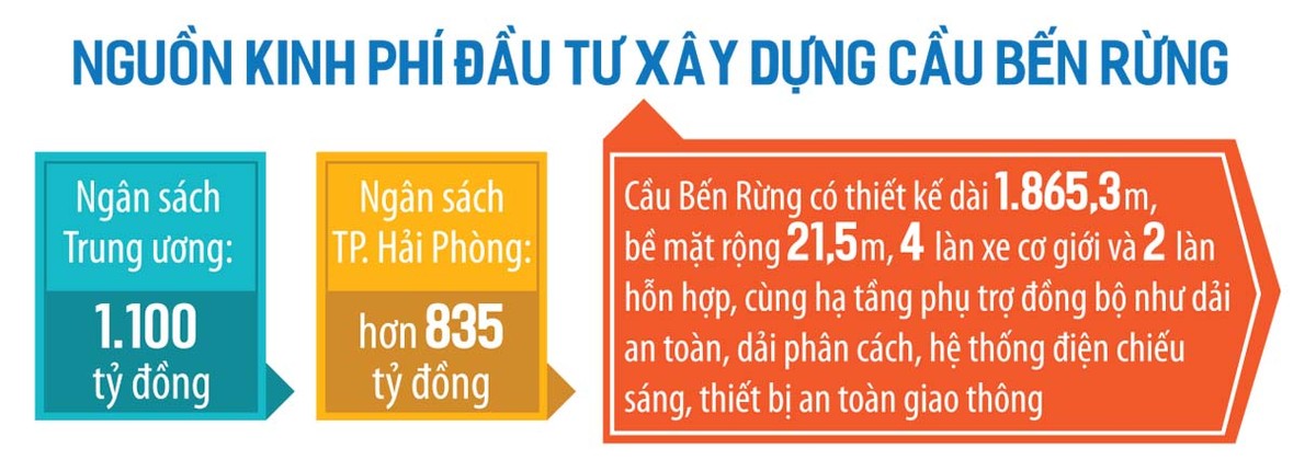 Trong đó, ngân sách Trung ương bố trí 1.100 tỷ đồng; ngân sách TP. Hải Phòng bố trí hơn 835 tỷ đồng. Cầu Bến Rừng dài 1.865,3 m; bề mặt rộng 21,5m; 4 làn xe cơ giới và 2 làn hỗn hợp, cùng hạ tầng phụ trợ đồng bộ như dải an toàn, dải phân cách, hệ thống điện chiếu sáng, thiết bị an toàn giao thông.