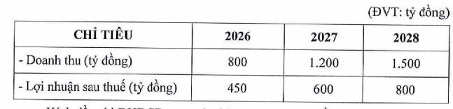 Về kế hoạch kinh doanh giai đoạn 2026-2028, DLG đặt mục tiêu năm 2026, doanh thu đạt 800 tỷ đồng, lợi nhuận sau thuế 450 tỷ đồng; năm 2027 doanh thu 1.200 tỷ đồng, lợi nhuận sau thuế 600 tỷ đồng; năm 2028 doanh thu 1.500 tỷ đồng, lợi nhuận sau thuế 800 tỷ đồng.
