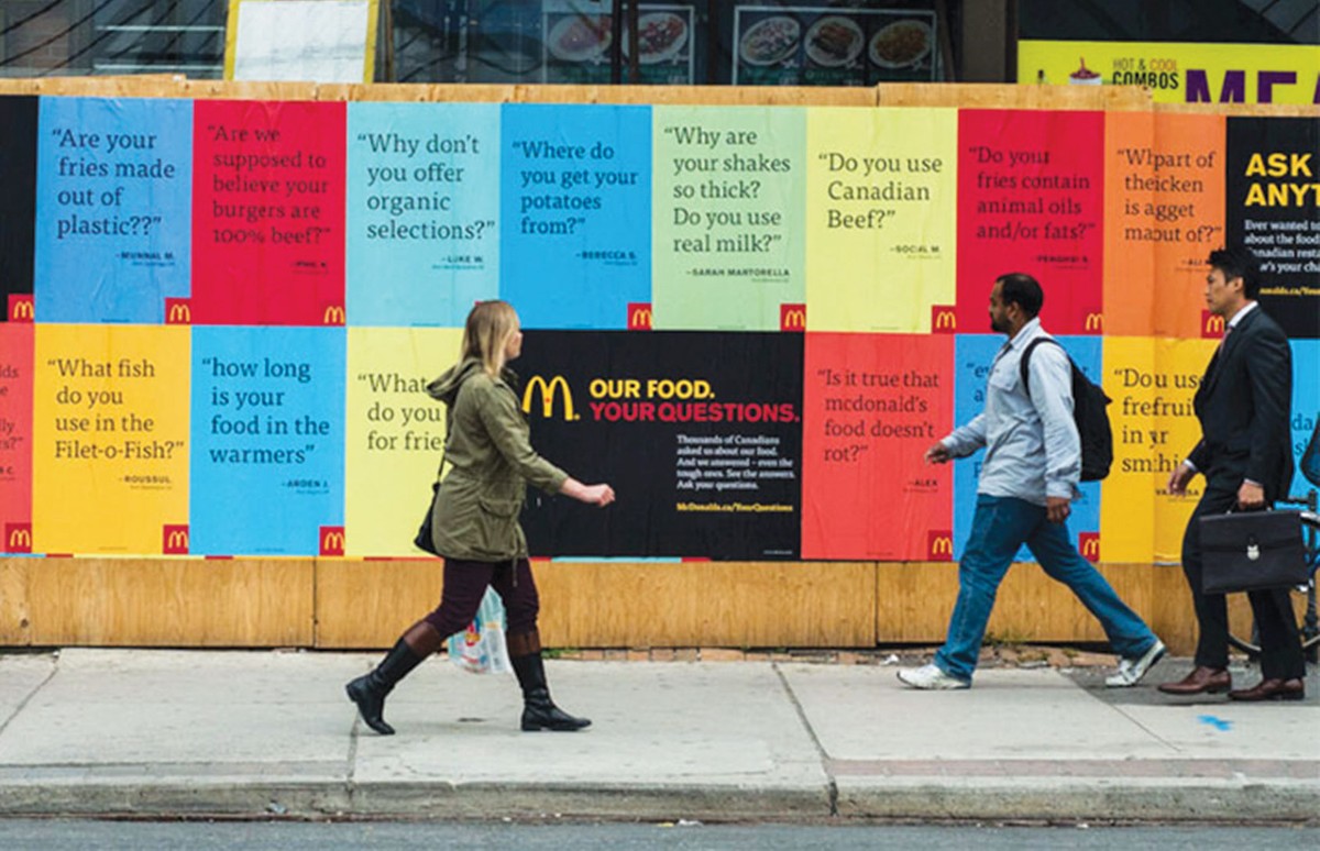 Chiến dịch “Đồ ăn của chúng tôi – Câu hỏi của bạn” (Our food – Your Question) do McDonald’s Canada thực hiện là một trong những chiến dịch marketing sử dụng sự minh bạch làm công cụ thành công bậc nhất và liên tục được giới chuyên môn nhắc đến. McDonalds từ lâu đã phải vật lộn với việc thiếu sự kết nối với khách hàng, dẫn tới khủng hoảng thông tin và hàng nghìn “lời đồn thổi” tiêu cực về thức ăn cũng như các loại nguyên liệu của nhà hàng.