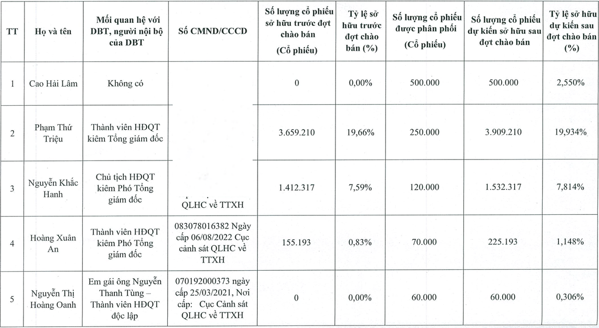 Danh sách nhà đầu tư dự kiến tham gia mua cổ phiếu đợt này của DBT có 5 nhà đầu tư cá nhân, bao gồm 4 lãnh đạo cấp cao của Công ty. Đáng chú ý là sự xuất hiện của nhà đầu tư mới Cao Hải Lâm hiện chưa sở hữu bất cứ cổ phiếu nào của DBT đã đăng ký mua 500.000 cổ phiếu.