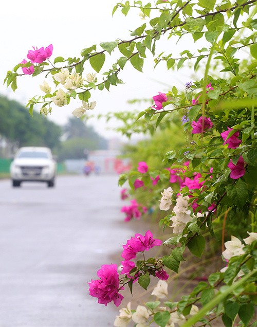 Dải phân cách nhỏ hai bên đường được trồng nhiều loại hoa giấy xanh tốt.