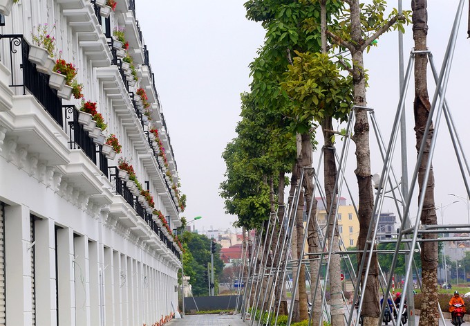Còn dải phân cách chính giữa rộng khoảng 3 m được trồng ba tầng hoa và cây xanh.
