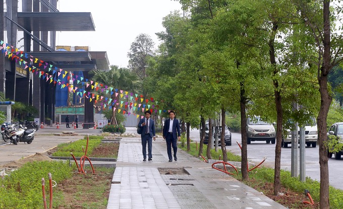 Một số đoạn vỉa hè đang được hoàn thiện. Nhiều đoạn được lát đá xanh rộng 3-7 m.