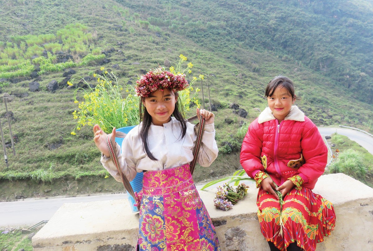 Ðón đoàn chúng tôi giữa núi rừng Hà Giang còn là những ánh mắt trẻ thơ trong veo đến lạ. Các em bé đầu quấn khăn hoa, lưng gùi hoa, vẫy tay chào khách giữa những lưng chừng đèo.