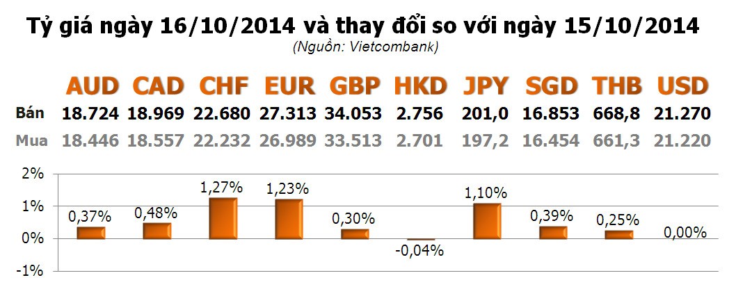Các ngoại tệ khác đồng loạt tăng, trong đó mạnh nhất là CHF với 1,27%; tiếp theo là EUR với 1,23%; JPY với 1,10%...