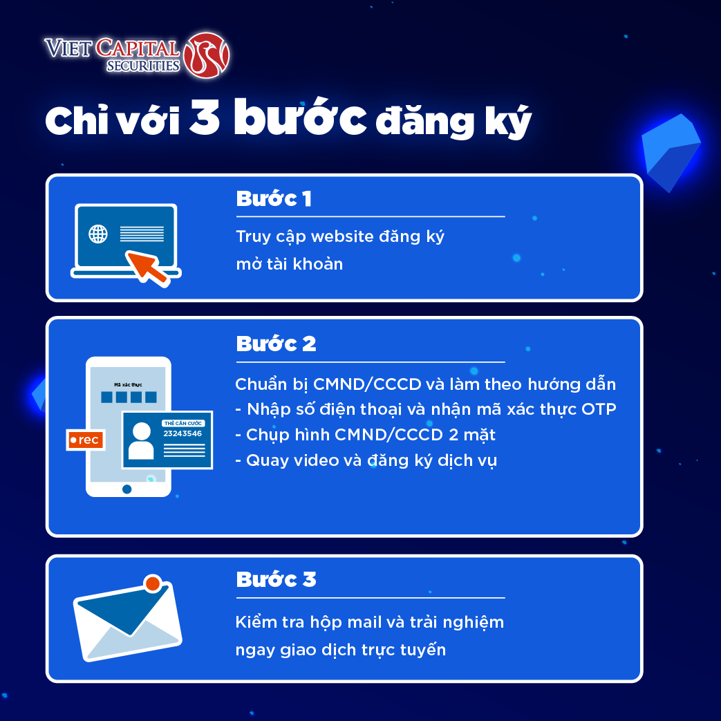 Chỉ mất 5 giây để mở tài khoản online cùng VCSC qua 3 bước đơn giản. Thực hiện liền tay bạn nhé!