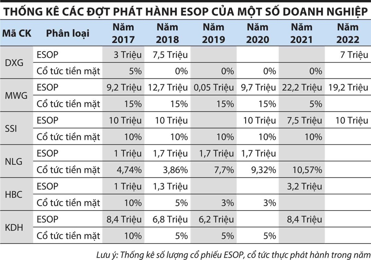 Nhìn chung, các doanh nghiệp phát hành ESOP trong nhiều năm thì cổ đông chỉ nhận được mức cổ tức khiêm tốn so với thị giá, thậm chí nhiều doanh nghiệp như DXG không trả cổ tức tiền mặt.