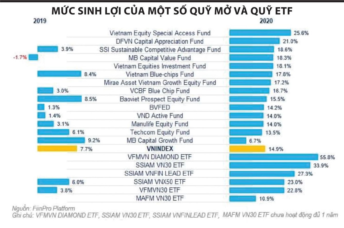 Năm 2020, theo số liệu của FiinGroup, quỹ hoạt động hiệu quả nhất là VFMVN Diamond ETF với mức sinh lời 55,8%, cao hơn hẳn mức tăng 14,9% của VN-Index và vượt xa mức sinh lời khoảng 10% của các quỹ ngoại như Premia MSCI Vietnam, V.N.M ETF.