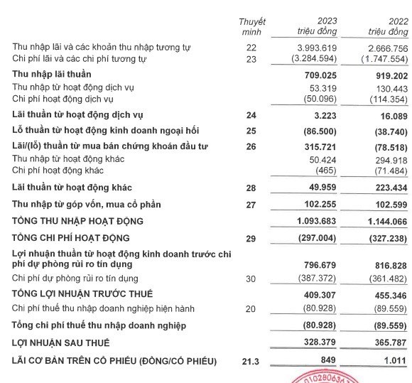 Theo đó, số liệu tài chính được kiểm toán năm 2023 của EVF không có sự chênh lệch so với số liệu quý IV/2023 đã công bố trước đó. Tổng thu nhập lãi và các khoản thu nhập tương tự năm 2023 đạt 3.993,6 tỷ đồng, tăng 49,7% so với năm 2022. Tuy nhiên, do năm 2023 là năm biến động rất mạnh của lãi suất huy động đầu vào, dẫn đến chi phí lãi toàn thị trường tăng mạnh, EVF cũng chịu sức ép chi phí lãi suất lớn, kéo theo thu nhập lãi thuần của năm 2023 đạt 709 tỷ đồng, giảm 22,8% so với lãi thuần năm 2022.