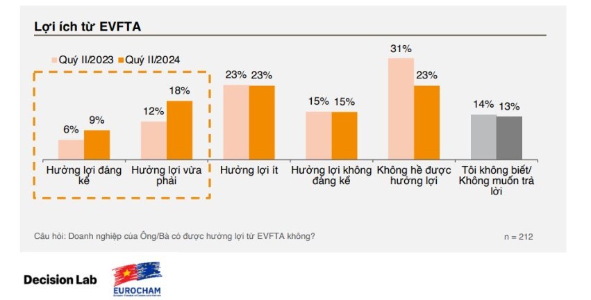 Khảo sát của EuroCham cho biết, gần hai phần ba số người tham gia khảo sát cho rằng họ đã nhận được lợi ích ở những mức độ khác nhau. Đáng chú ý, 27% công ty (tăng đáng kể so với 18% vào năm 2023) hiện đang nhận được những lợi ích từ mức độ vừa đến rất lớn, trong khi một phần tư khác, giảm so với 31% vào năm 2023, vẫn chưa thấy bất kỳ lợi ích hữu hình nào.