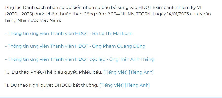 Theo đó, danh sách nhân sự dự kiến nhân sự bầu bổ sung vào HĐQT Eximbank nhiệm kỳ VII (2020 – 2025) được chấp thuận theo Công văn số 254/NHNN-TTGSNH ngày 14/01/2023 của Ngân hàng Nhà nước Việt Nam gồm 3 thành viên.