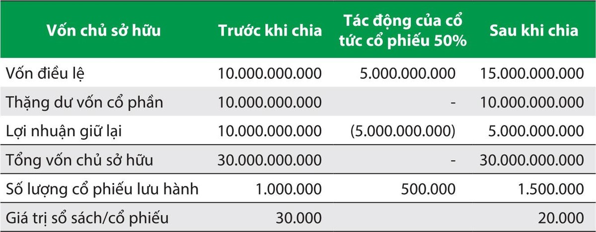Ví dụ minh họa đơn giản trường hợp chia cổ tức bằng cổ phiếu với tỷ lệ 50% bằng nguồn lợi nhuận giữ lại, nhà đầu tư sở hữu 100 cổ phiếu được nhận mới 50 cổ phiếu. Tuy nhiên, tổng vốn chủ sở hữu không thay đổi và giá trị sổ sách giảm đi tương ứng.
